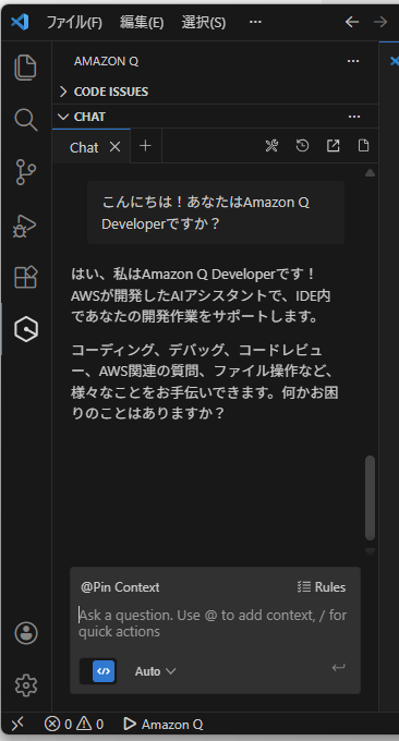 Amazon Q Developerにチャットできるタブが左側に表示されました。試しにチャットしてみました。