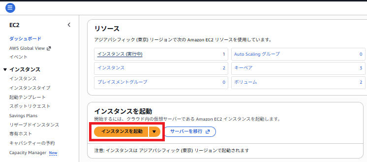 ダッシュボードから「インスタンスを起動」ボタンを押下します。