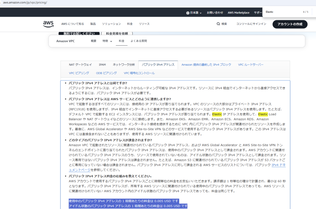 使用中のパブリック IPv4 アドレスの 1 時間あたりの料金は 0.005 USD です