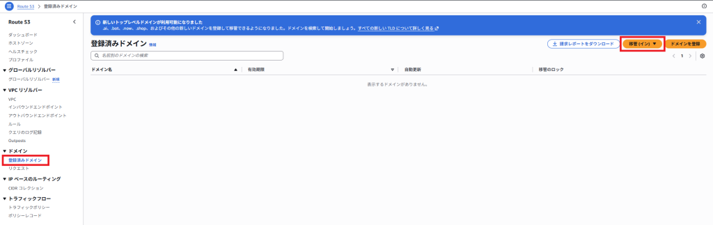 ドメインレジストラでドメインを解約したら、AWSのRoute 53にドメインの管理を移管していきます。