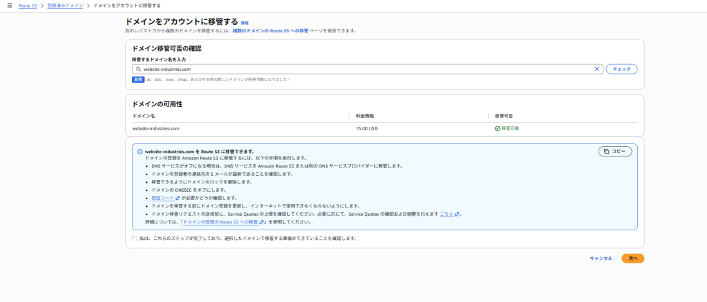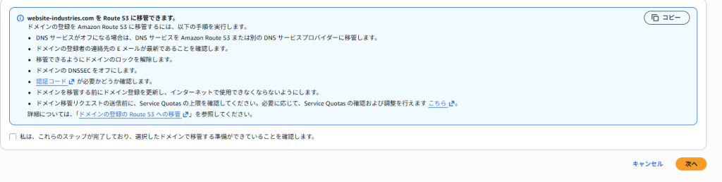 移管する際の注意書きをすべて読み、確認出来たら「私は、これらのステップが完了しており、選択したドメインで移管する準備ができていることを確認します」にチェックを入れて次へボタンを押下します。