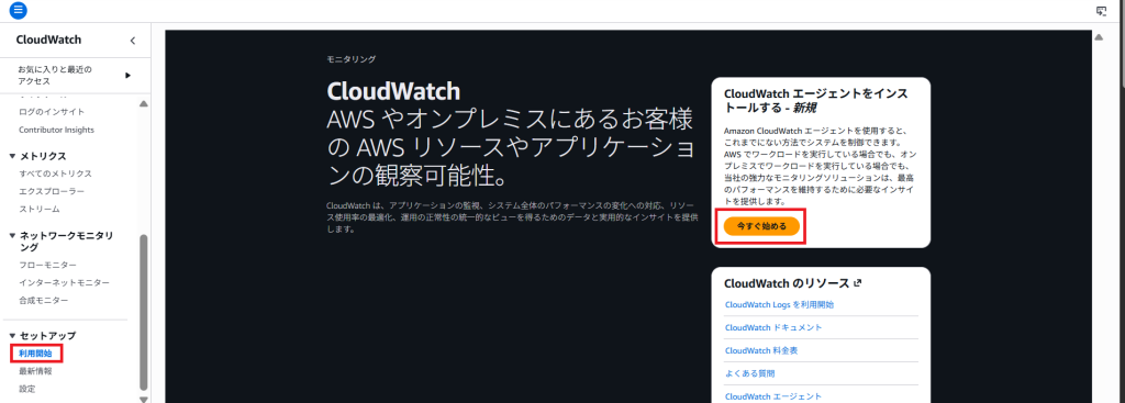 次に左ペインからセットアップ>利用開始をクリックします。右側にある「CloudWatchエージェントをインストールする」にある「今すぐ始める」ボタンをクリックします。