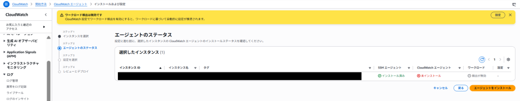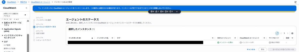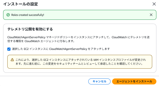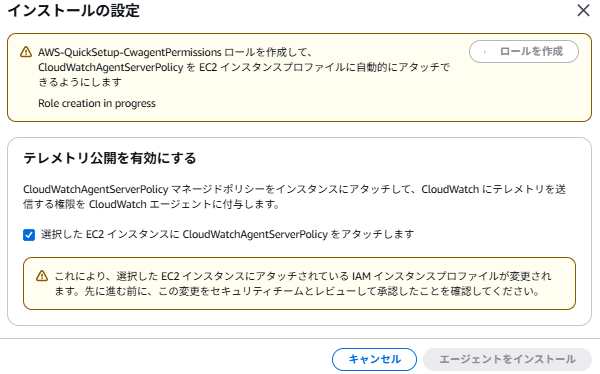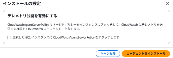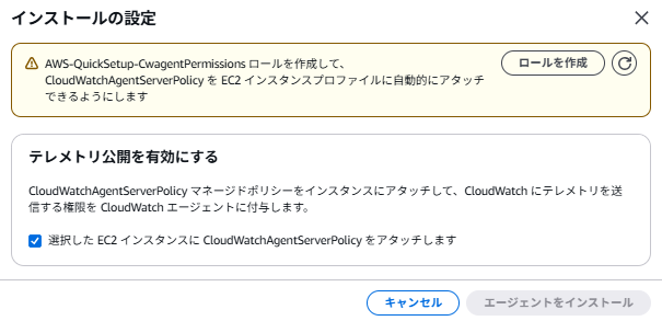 なお、テレメトリ公開を有効にするのチェックを外してもインストールはできますが、この状態だとCloudWatchにEC2の情報が送信できない状態でCloudWatch Agentがインストールされます。