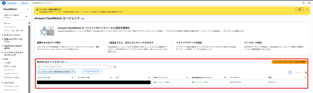 CloudWatch エージェントを設定し終わると上部に以下の表示が出ます。