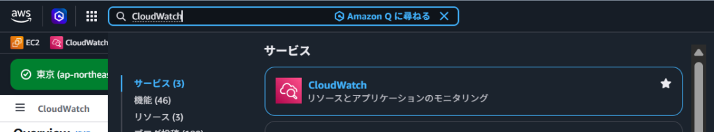 まずはCloudWatchのサービス画面へアクセスします。