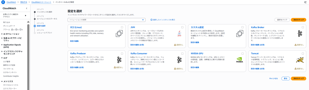 この画面では何もせずにCloudWatch エージェントを設定ボタンをクリックします。