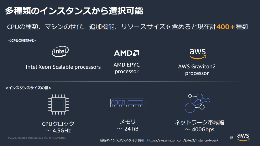 一般家庭向けのWindowパソコンでも使われるプロセッサを開発しているIntelのサーバー用CPU、XeonなどをEC2インスタンスに対して使用することができます。