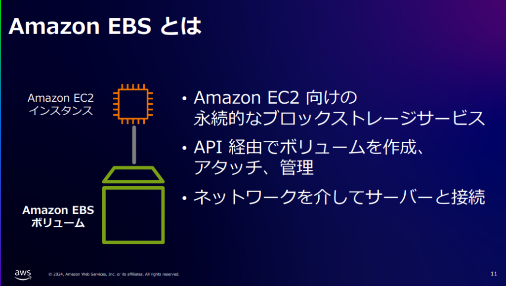 EC2で立ち上げたサーバー上のOSのデータは、EBSに保存されます。EBSはEC2で立ち上げたインスタンスにアタッチする形で使用します。