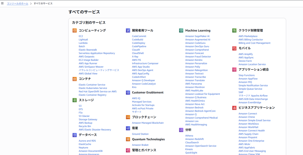 マネジメントコンソール(AWSのサービス管理画面)から確認できるサービスの数はとても豊富です。