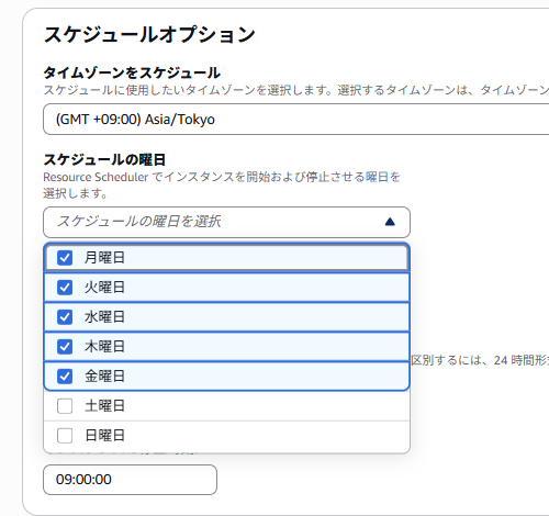 EC2インスタンスの曜日と開始時刻、停止時刻を設定します。