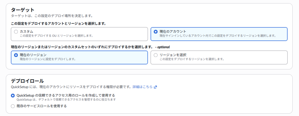 今回はターゲットを「現在のアカウント」と「現在のリージョン」を指定し、デプロイロールを「QuickSetupの信頼できるアクセス用のロールを作成して使用する」を選択します。