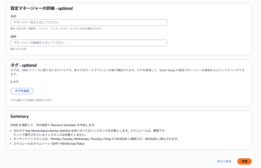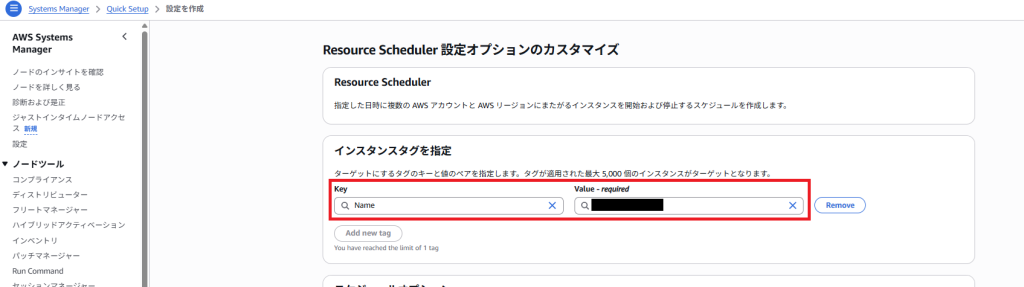 SSMのQuick SetupのResource Schedulerを作成します。先ほど確認したEC2インスタンスのタグを入力します。