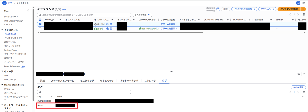 自動起動・自動停止を設定するEC2インスタンスのタグを確認します。EC2にアクセスして対象のEC2インスタンスに設定されているNameタグを確認します。