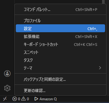 まずVS Codeの左下にある歯車アイコンから設定を開きます。