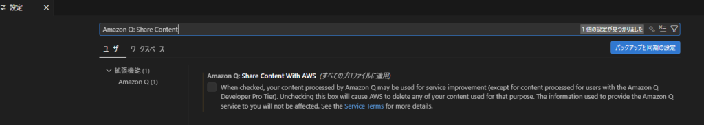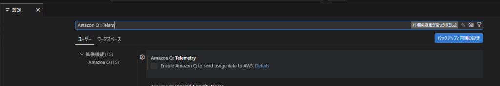 VS Codeの設定からAmazon Q Developerがテレメトリの収集をしないようにするのとコンテンツを共有しないようにする